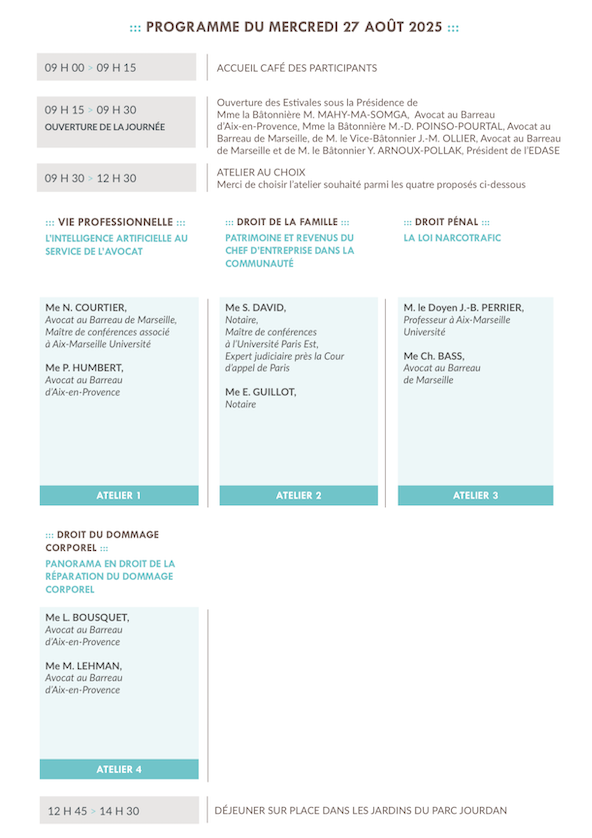 Retour sur les estivales du 27 août 2025 organisées par le Barreau d’Aix-en-Provence (Ordre des avocats d’Aix-en-Provence) et le Barreau de Marseille (Ordre des avocats de Marseille).